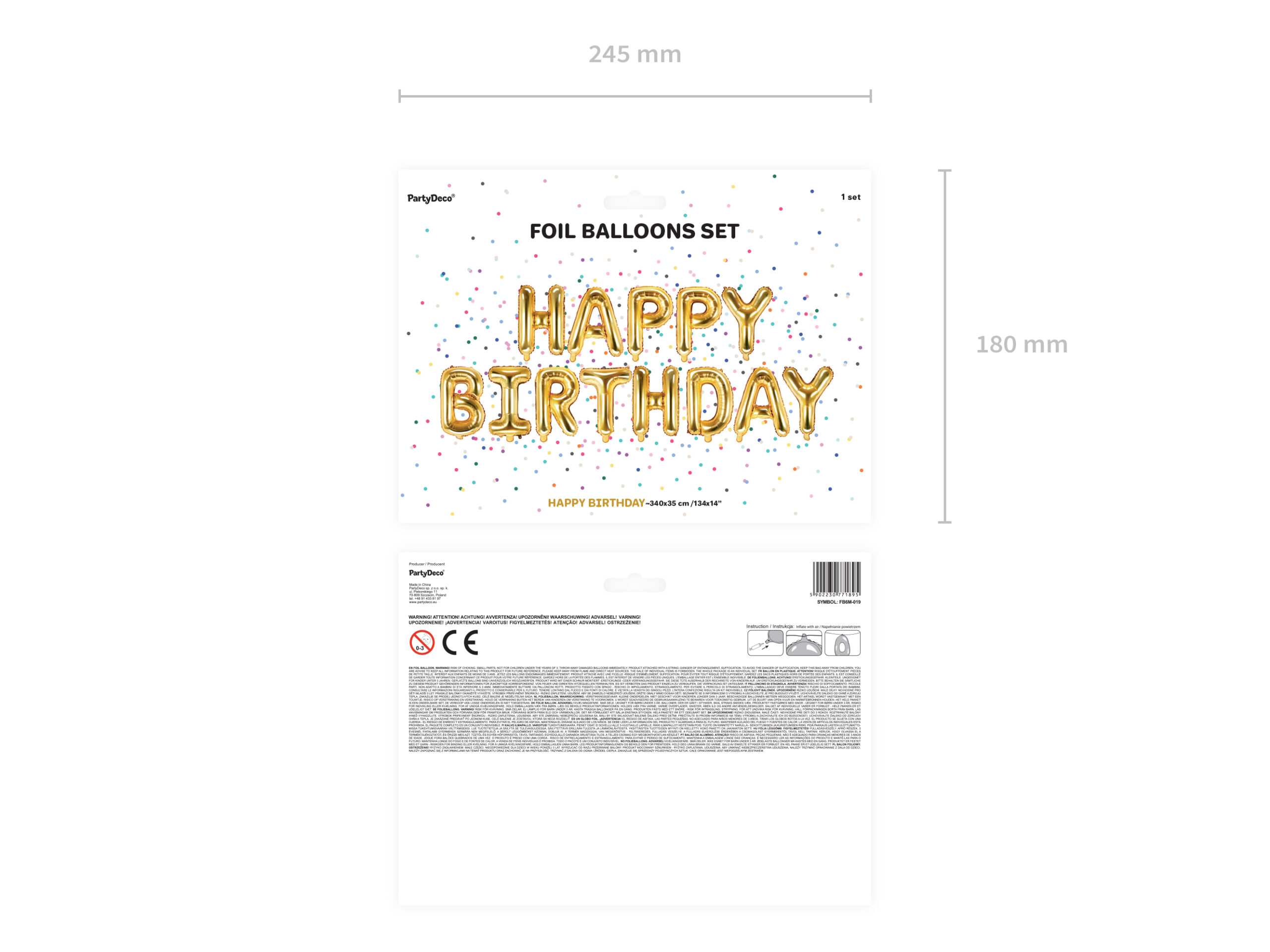 • Металик балон од фолија со натпис „Happy Birthday“ наменет за полнење со воздух.