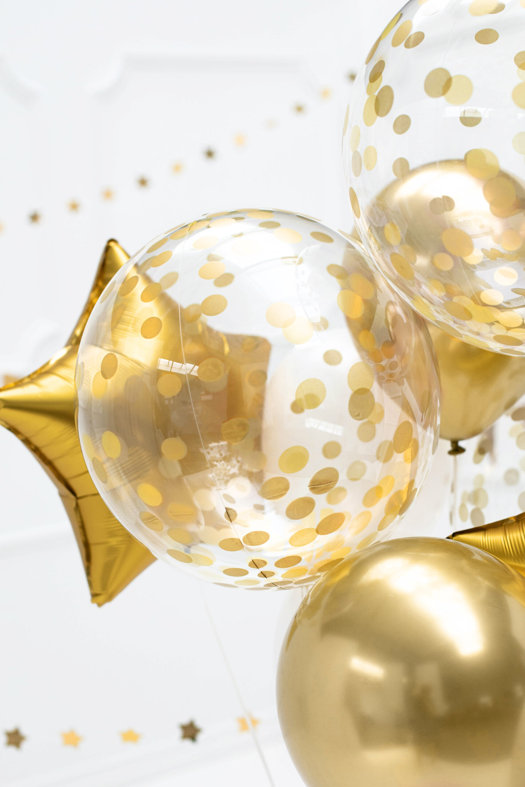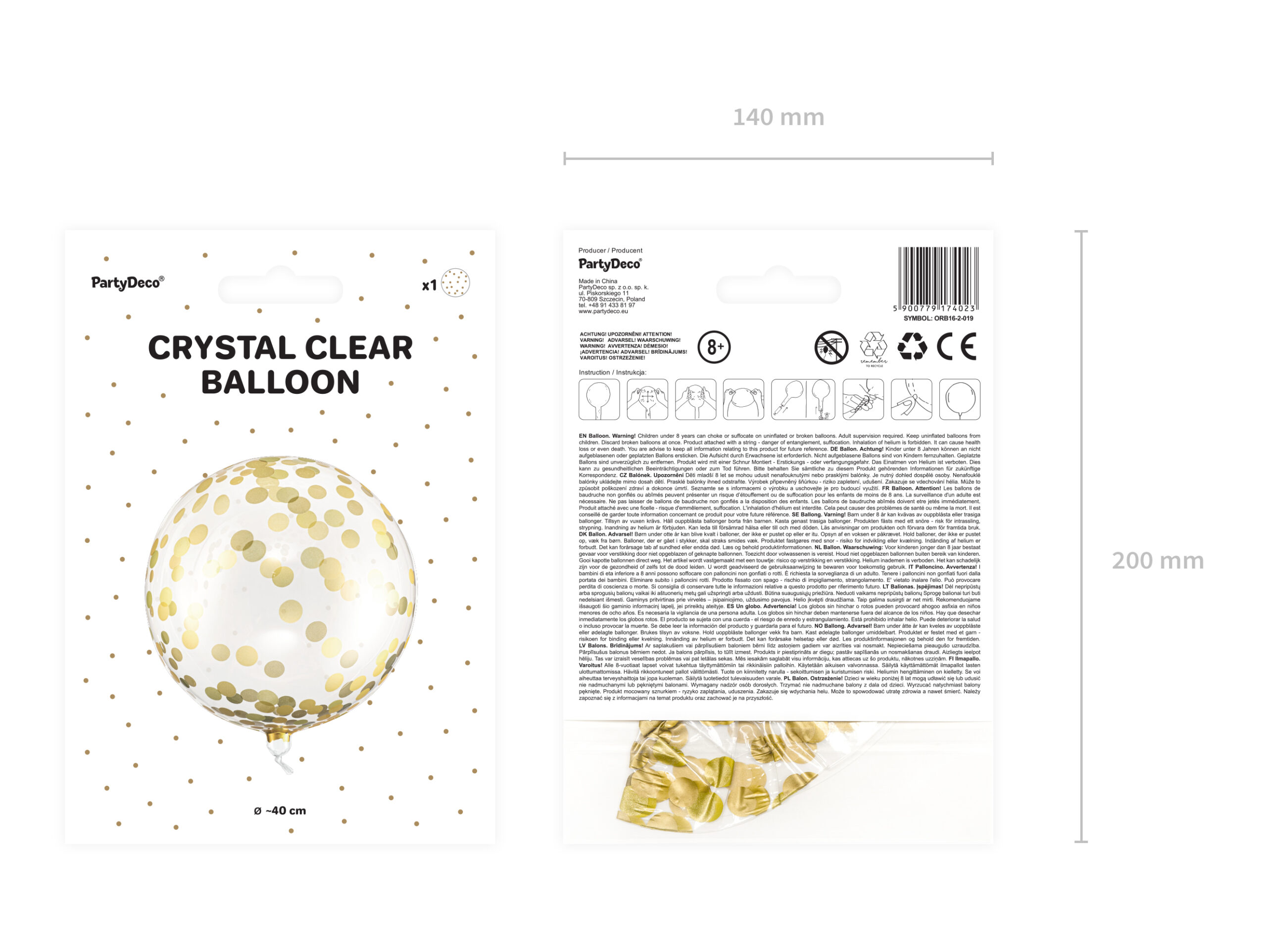 • Проѕирен кружен балон со златни точки наменет за полнење со воздух или хелиум. • Дијаметар 40цм.