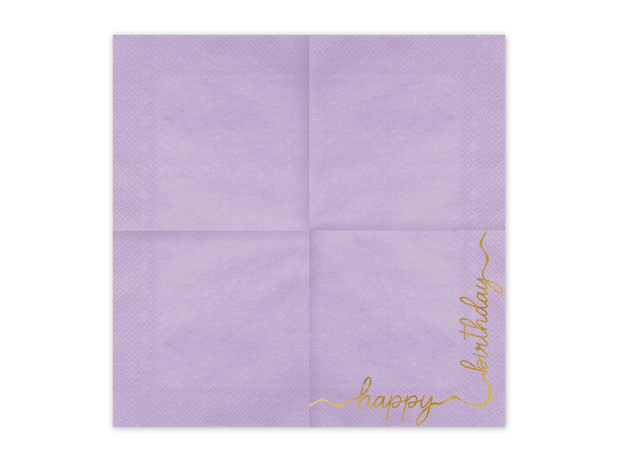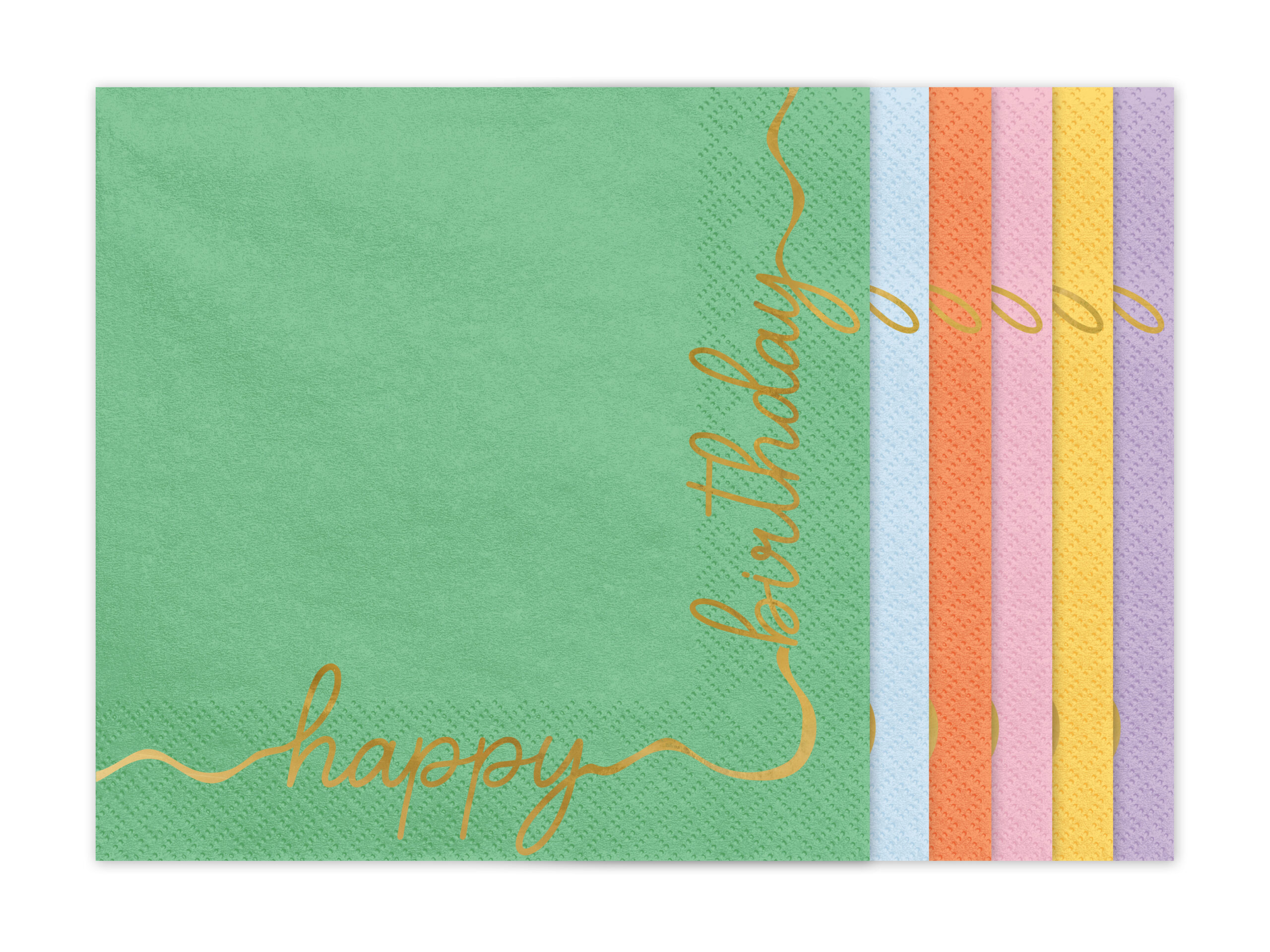 • Хартиени салфети во 6 различни бои со златен текст „Happy Birthday“. • Димензии, приближно 16.5 x 16.5 цм. • Пакувањето содржи 12 парчиња.