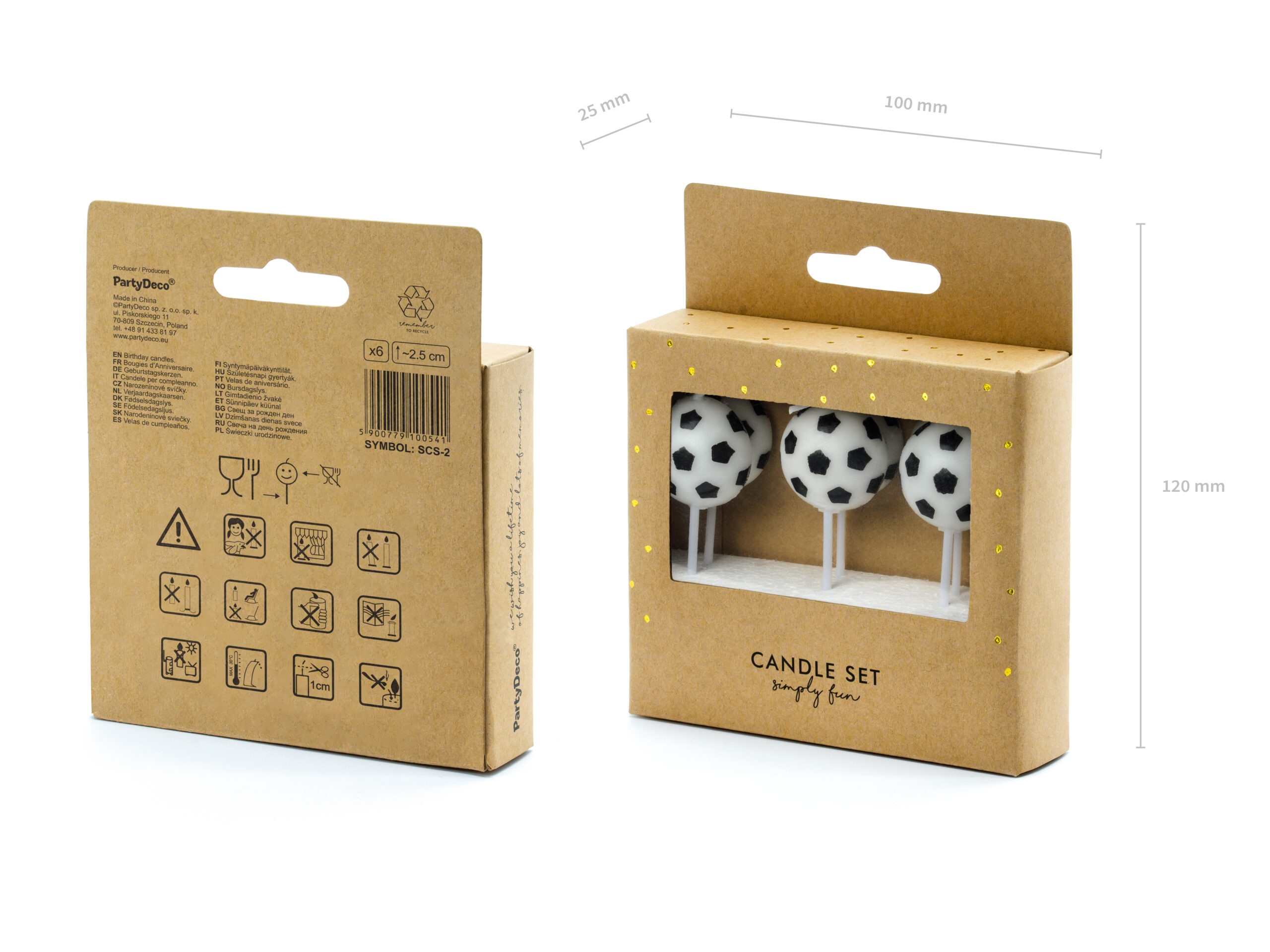 • Роденденски свеќи во форма на “Фудбалски топки” на стапче. • Висина приближно 2.5 цм. • Пакувањето содржи 6 парчиња.